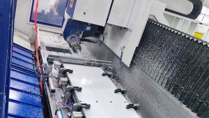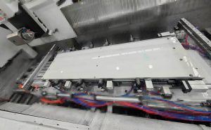 以新能源电池托盘底板为例,该类工件通常需在一次装夹下完成四个面的加工。传统解决方案多依赖龙门式加工中心,然而此类设备成本高昂、效率有限,且上下料及对刀频次较多。